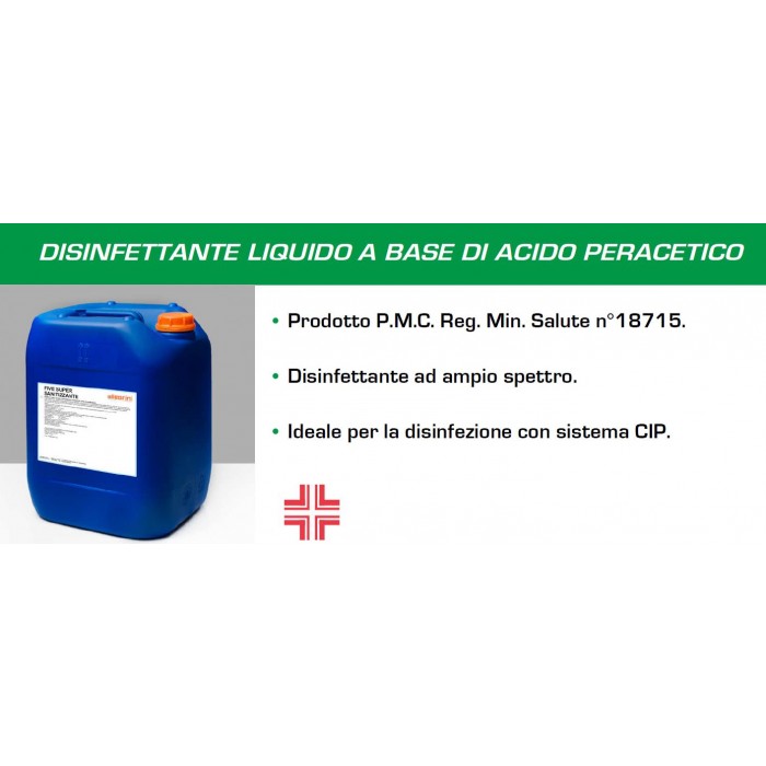 FIVE SUPER SANITIZZANTE è un disinfettante acido, fortemente ossidante, non schiumogeno, esente da cloro, facilmente biodegradabile e quindi accettabile dal punto di vista ambientale. Il prodotto è idoneo nel settore produttivo zootecnico. E' efficace su tutti i tipi di microrganismi anche a basse concentrazioni e basse temperature di esercizio. Alle diluizioni d'uso il prodotto non è corrosivo e può essere utilizzato sui seguenti materiali: acciaio inox, ferro zincato e banda stagnata, vetro, porcellana, polietilene, teflon,polistirolo, pvc, smalti e superfici in gomma. Ideale per la disinfezione