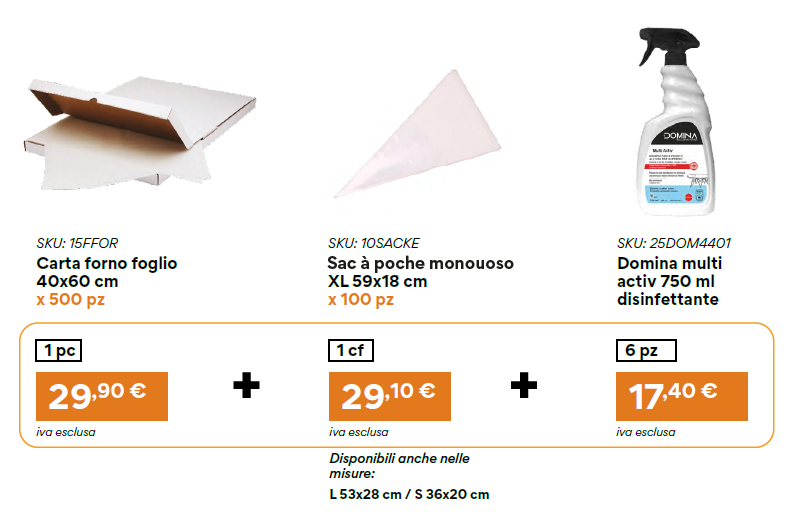 Tris speciale per pasticcerie Carta forno + Sac à poche + Disinfettante